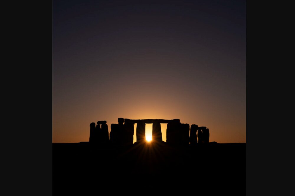 در این عکس، از میان سنگهایی که ۴۵۰۰ سال پیش دقیقاً چیده شدهاند، گوی بزرگ و درخشان ۴.۵ میلیارد ساله خورشید در حال غروب دیده میشود.